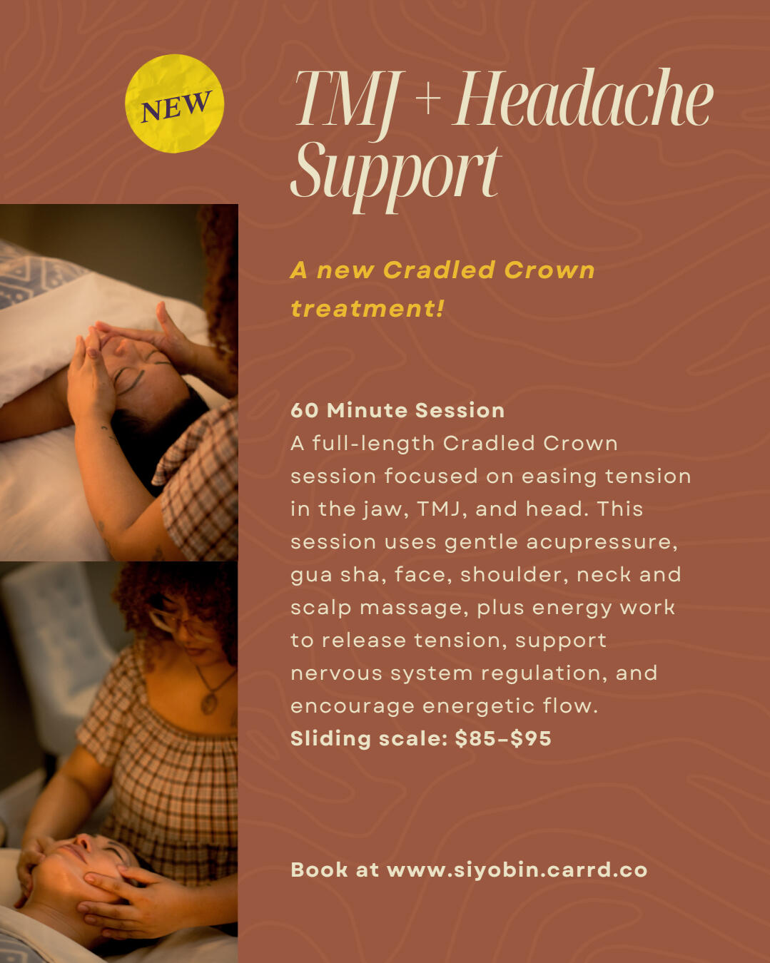 👑 Cradled Crown supports relaxation, presence, and flow through the head, neck, shoulders, and scalp. Gentle, intentional touch, gua sha, acupressure-style holds, and scalp massage blend with Reiki and energy work to create comfort and ease. With the option to focus on TMJ & Headache Relief, as well.💆♂️ Guided by your intentions and comfort, each session helps you leave feeling grounded, clear-minded, and nurtured.✨ Many people describe leaving feeling more grounded, clear-minded, and at ease. Feeling held, nurtured, and renewed.Session Lengths: 30, 60 and 90 Minute